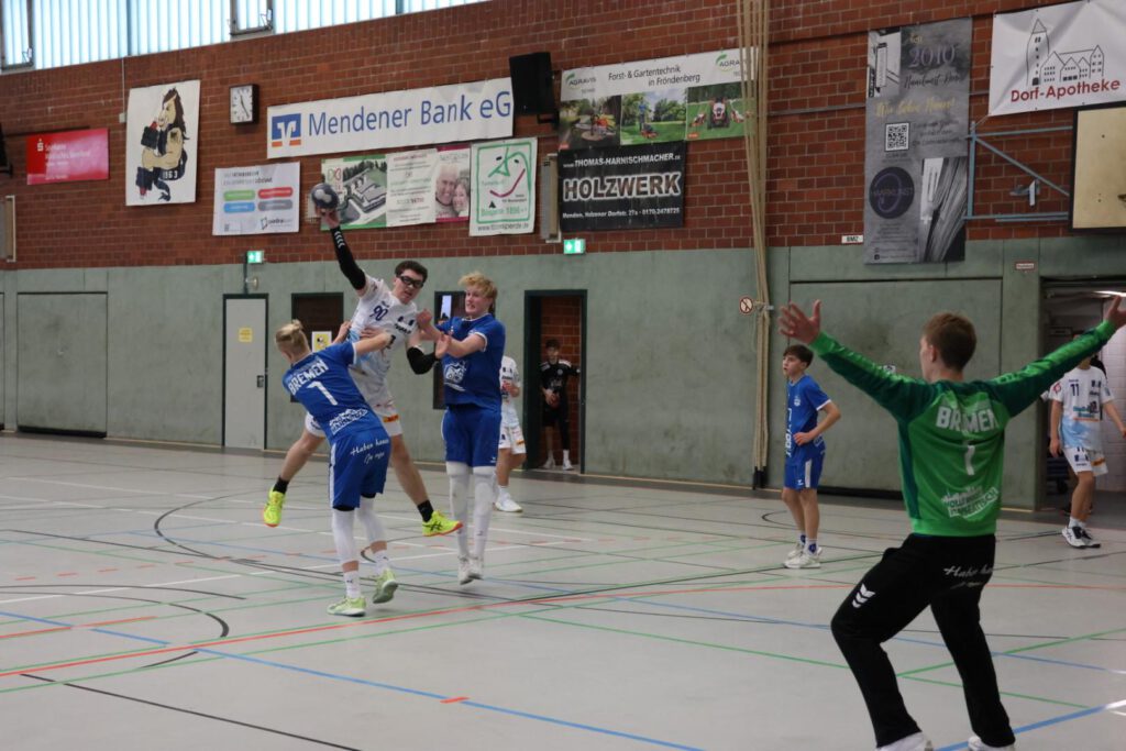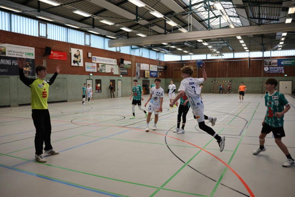 Dadurch, dass wir am ersten Tag schon früh morgens spielen mussten, begann die Nachtruhe um 22 Uhr. Der Wecker klingelte um 6:30 Uhr, kurz frisch machen, Tasche packen und los zum Frühstück. In der Mensa der Realschule Menden gab es ein Büffet mit allen wichtigen Lebensmitteln zur Stärkung für die ersten Spiele. Aufgrund der Witterung kamen die Eltern schon um 7:40 Uhr zum Transport zum Spielort nach Bösperde, wo die HTS/BW96 Handball (Hamburg), der HC Erlangen (Bayern), der ATSV Habenhausen (Bremen) und die Füchse Berlin auf uns warteten. Die Ziele waren es, in der Abwehr an der Positionierung -, Lenkung des Gegenspielers -, sowie aktiven (ballorientierten) Zweikampfführung zu arbeiten; im Angriff die Räume ohne Ball anzulaufen – und Weiterspielmöglichkeiten in Breite und Tiefe zu kreieren.