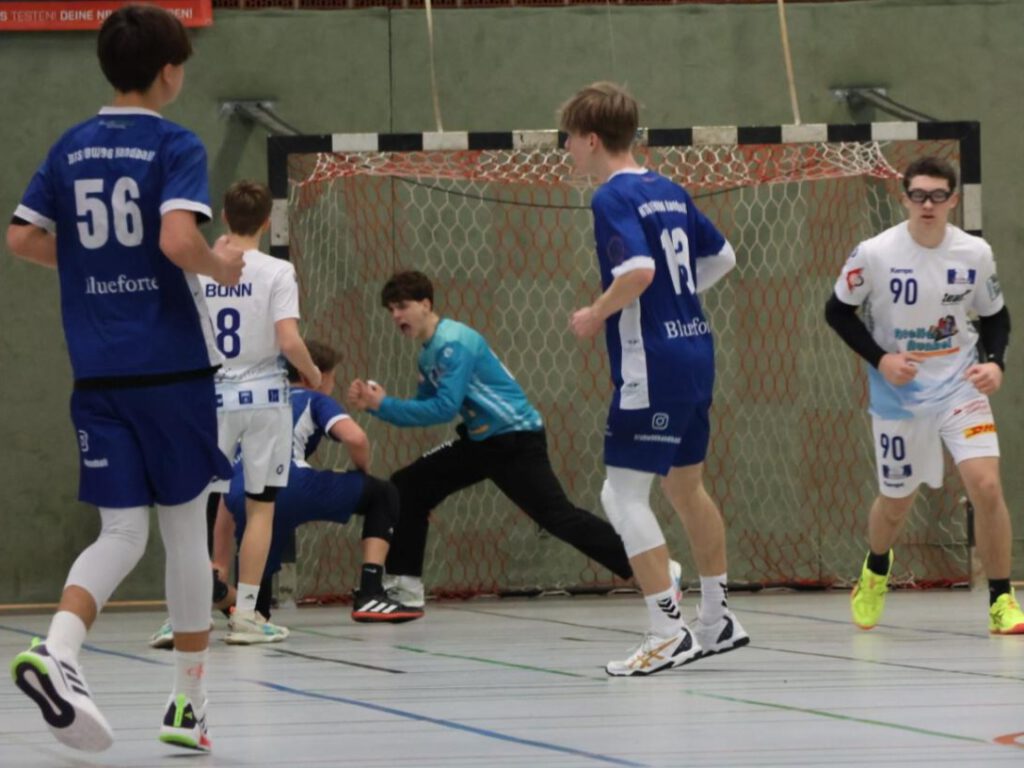 Mit dem Wissen, dass man aus dem Turnier nun ausgeschieden war, wartete auf uns im letzten Spiel der Regionalligaspitzenreiter des HV Nordrhein – Bayer Dormagen. Alle Bonner waren aber sehr motiviert, da die Spieler sich schon aus zahlreichen Duellen und der Auswahl etc. kannten. Es sollte ein ein sehr intensives Spiel werden, bei welchem besonders die Torhüter und die 1gg1 starken Spieler brillierten. Besonders Samuel konnte sich durch einige außergewöhnliche Paraden gegen freie Bälle der Dormagener auszeichnen und hielt zusammen mit der Achse Benjamin-Ruben im Angriff gegen eine starke Dormagener Mannschaft (am Ende des Turniers im Endspiel – und dort erst im dramatischen Siebenmeter-Werfen vom bis dahin überragenden SC Magdeburg geschlagen) bis zur 20. Minute auf Augenhöhe dagegen. Am Ende war das Glück etwas gegen uns und nach zwei Strafzeiten musste man sich auch hier knapp mit 13-16 geschlagen geben.